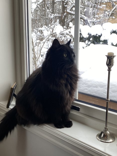 Helt svart, lang pels. Litt tjukk og lysner til Nima. (er sær til andre mennesker)