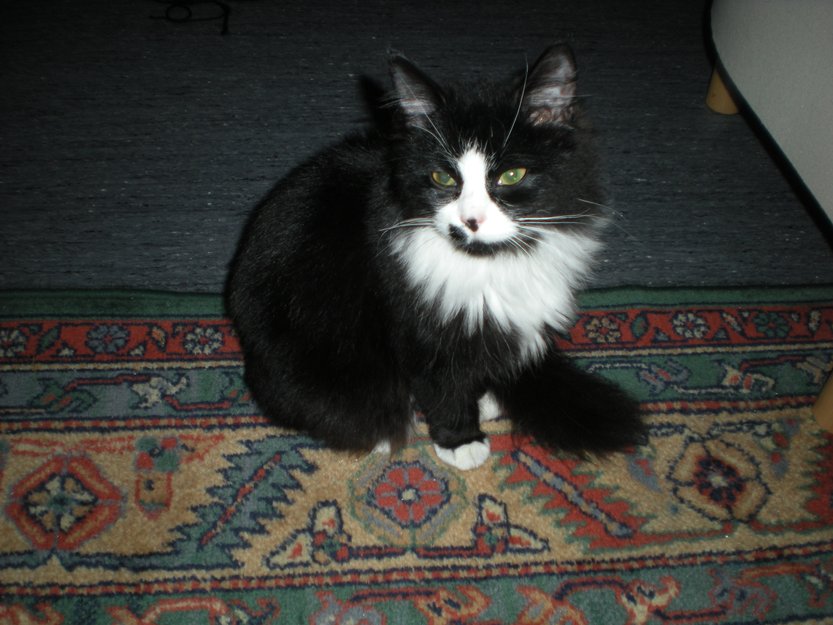 lola er ei svart og hvit katt.hun har et svart prikk nesten i nærheten av nasen sin som dere kan se på bilde.hun har hvit føtter.og grønne øynene .hun har rundt 2-3 tenner som er knekt på fremsiden.hun datt fra 6 etasjen da hun var liten.hun har hvit pelse på magen.