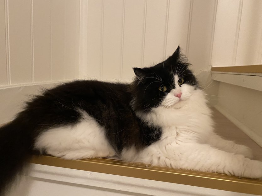 Gizmo er 3 år er helt hvite på undersiden og han har svart pels på venstre foten på baksiden. Han er kastrert og veldig snill.