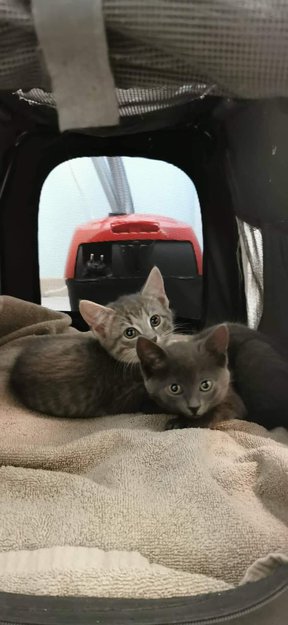 Begge kattungene har blitt undersøkt av dyrlege og får nå mat tilpasset alder, er hunkjønn og i god form. Den ene har fått skadet en melketann men dyrlegen sier at kattungen ikke er preget av dette. Kan tenkes at kattungene kommer fra en gård eller har oppholdt seg noe i fjøs mtp lukt.