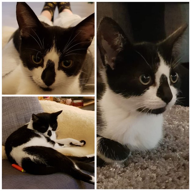 3 år kastrert gammel jente. Heter Ville pga v-formen i ansiktet. Svart og hvit. Hun er chippet og har øretatovering. Bak på ryggen ved halen har hun en brunfarget flekk i pelsen. Tynn og litt liten i størrelsen. Elsker kos og oppmerksomhet.