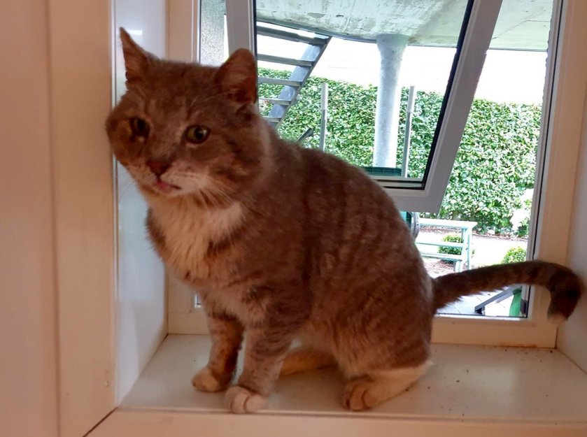 Hannkatt med rennende øyne, blodig snørr, knekte/manglende tenner. Hovne gummer og kinn. Tofarget pels, grå med hvitt parti rundt munn, hals og poter.