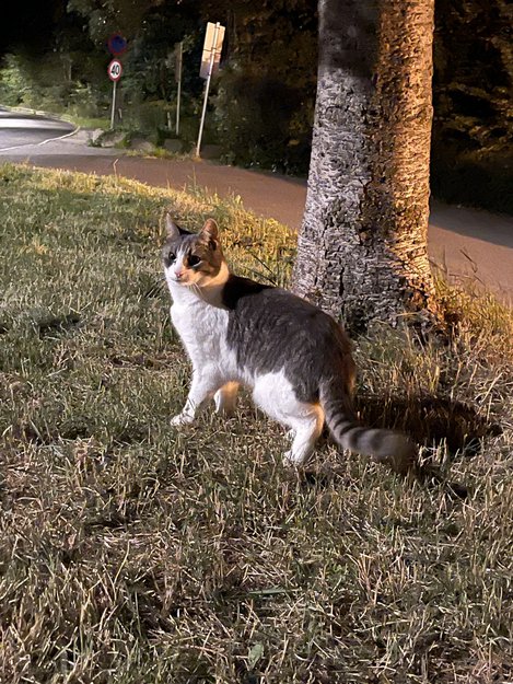 Katten kom løpende til meg over veien og er ekstremt vokal og imøtekommende, men ser veldig forvirret/redd ut. Den springer vekk og gjemmer seg når det kommer biler. Hvis jeg går så følger den etter
