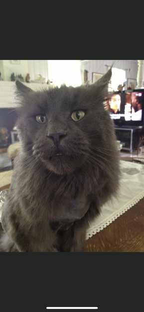 Grå stor pus som lyder navnet sitt, han er kosete og snakker mye.