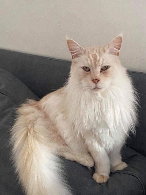 Gusse er en stor langhåret hvit Maine Coon katt med beige undertoner og karakteristiske øretuster. Han er stor, på grensen til lubben. Gusse er 7 år og er vaksinert og kastrert. Han er litt avventende til fremmede, men sier ikke nei til å bli klødd bak ørene.