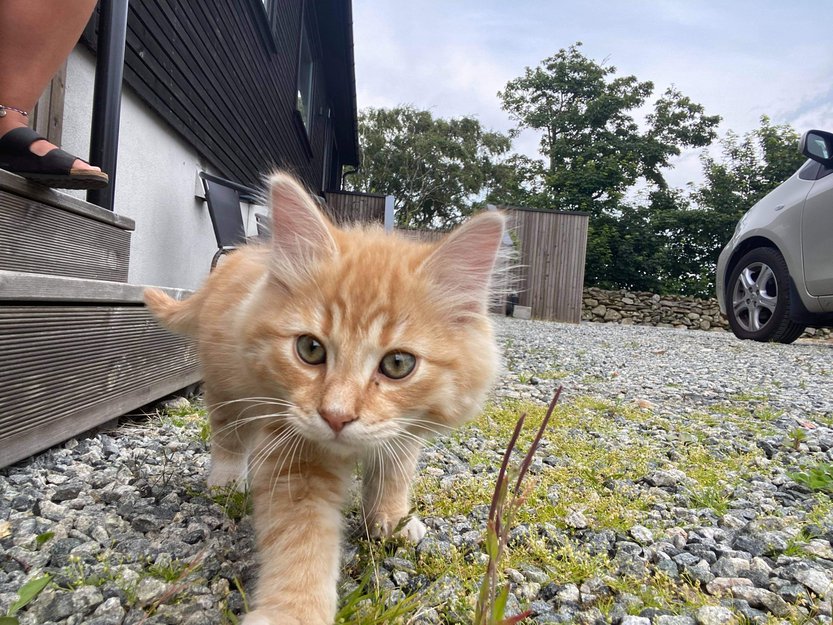 Oransje farge på og langhårete. Noe mer hvit under magen.