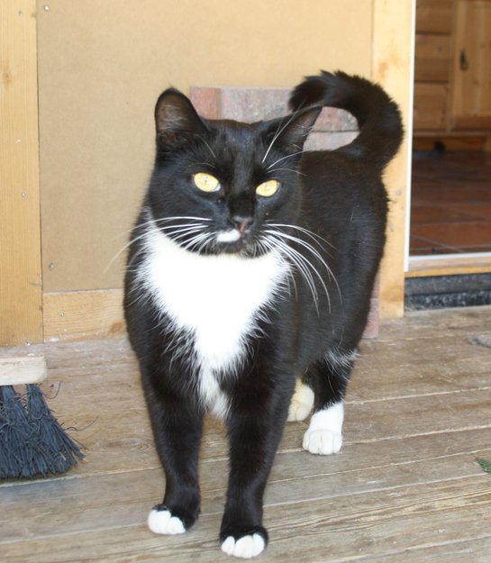 Hvit flekk ved høyre munnvik, og hvite tær på frampotene. Hun er tam, men skeptisk til fremmende. Født 28.04.2010. ID-merket med chip, men denne kan ha sluttet å fungere.