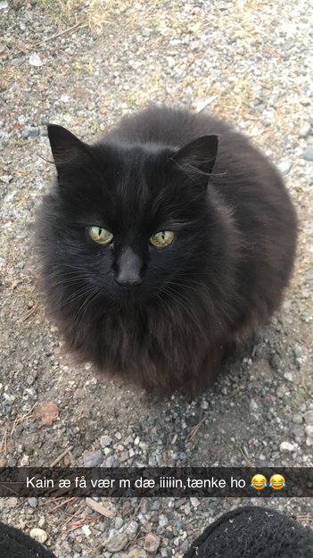 Lang håret svart katt,litt grå/rødlig i fargen på sommeren.Manglet flekker med hår etter klipping av knuter i vår.Veldig sosial og glad i folk,ikke halsbånd.