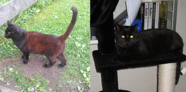 Litt hengemage, svart pels - med mindre man ser henne i et visst lys (ref bildet), hvor pelsen da kan se rødbrun ut. Lang, tynn hale.