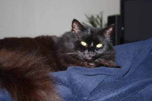Han er 13 år gammel. Svart, langhåret. Han er generelt sett ikke redd for mennesker, kosete og veldig kontaktsøkende.