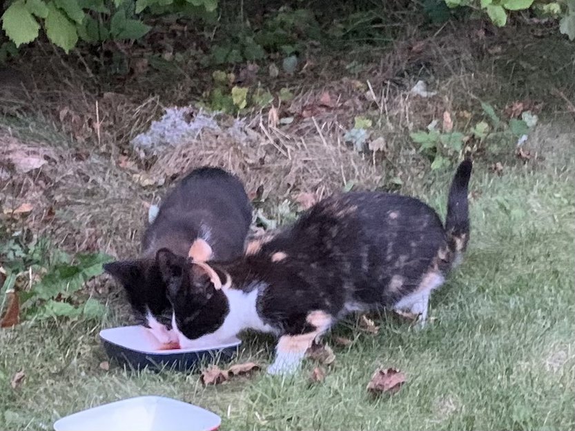 Vi fant to kattunger i buskene på hytta vår i dag, ca 3 mnd gamle. En svart og hvit og en svart, hvit og litt oransje. Mor gjemte seg, men så ut som en litt mørk trikolor. Veldig sky og sultne.