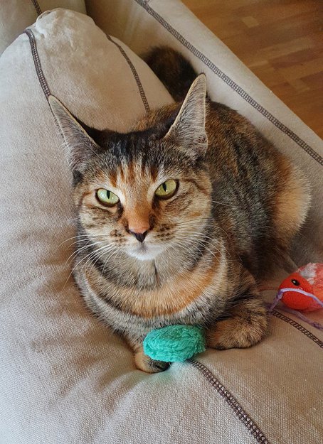 Tabbymønstret med mye brun og litt grått. Har en bitteliten brun prikk på toppen av hodet.