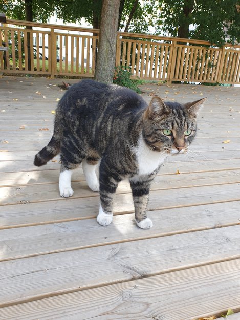 Katten har holdt seg i området her lenge og blitt observert av flere, men ingen vet hvem evt eier er. Ingen synlig id-merking. Katten virker tillitsfull, sulten og noe forlatt/fortapt. Mjauer og søker kontakt.