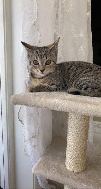 Seks mnd gammel og litt spe i kroppen. Lys grå i farge med mørkere grå striper. Noen felter med litt gyllen/ veldig lys brun farge. Oppå nesa har ho også denne fargen. Noe hvit under munnen og hakepartiet. Poter i samme farge som pelsen ellers (Ikke hvite).