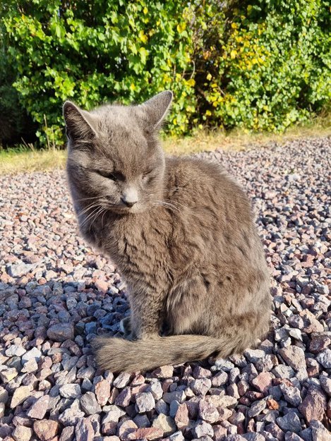 Tynn og medtatt katt med sår i munnen, satt ubevegelig ute. Tatt med hjem og gitt mat. Har blitt observert i nabolaget Spurvestien i to uker.