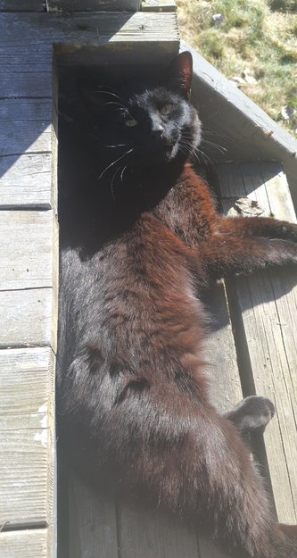Svart på avstand, men brun under belysning. Han har noen få hvite hår på tilfeldige steder på kroppen.