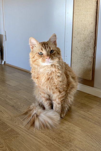 Han ble tatt inn av dyrebeskyttelsen Lillehammer og er i fosterhjem i Moengvegen (Lillehammer) Kom seg dessverre ut gjennon vindu..