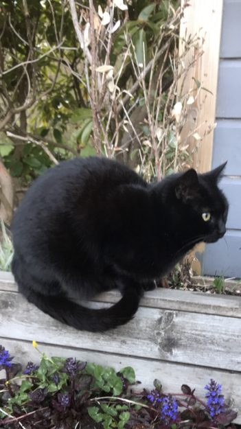 Kitty er helt svart, og hun har tatt av litt i sommer så hun er ganske slank. Har normalt blank pels men etter å ha vært hjemmefra i over en uke kan hun kanskje se litt pjusk ut nå.