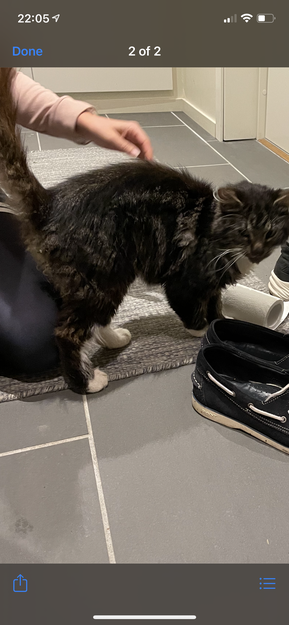 Katt funnet utenfor huset. Har blitt observert av flere i lengre tid. Sår på halsen, mager og uflidd i pelsen. Søker menneskekontakt.