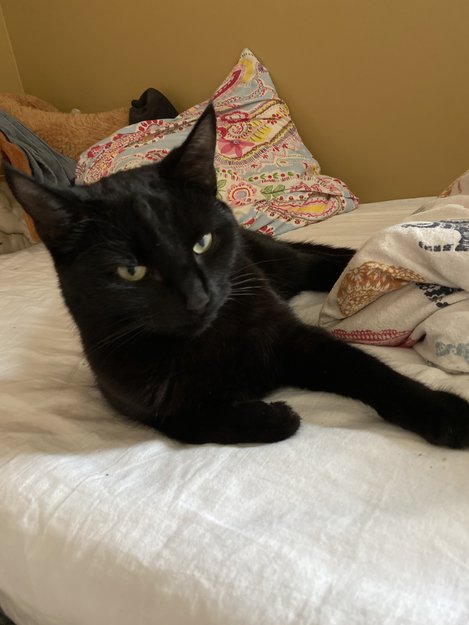 Mellomstor slank og helt sort, korthåret. Han mangler en av hjørnetennene i overmunnen.