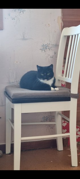 Hun er helt svart meg hvit bryst litt hvit på potene og litt hvit mellom øynene.