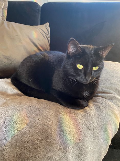 Liten katt. 3 år gammel. Helt svart, med lite hvitt merke i brystet.