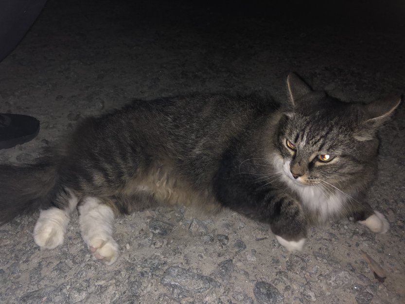 Funnet gråtende og mjauende i sanddynene på Borestranda. Virker ikke som den er skadet. 2 store flåtter en på hals og en på hode. Redd, men fikk kose etter en god del tålmodighet. Da ville den ikke gå av meg og klamret seg fast.