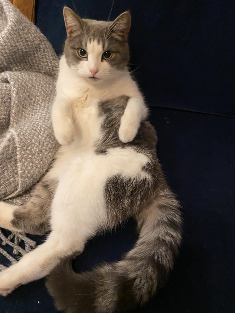 Hun har en hvit flekk i den grå pelsen (mage) på venstre side. Hun har en beige flekk under haken.
