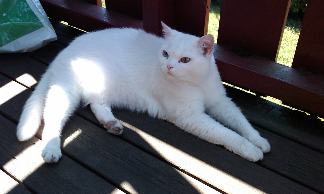Hvit pen katt med blått og gult øye. Veldig bløt pels.