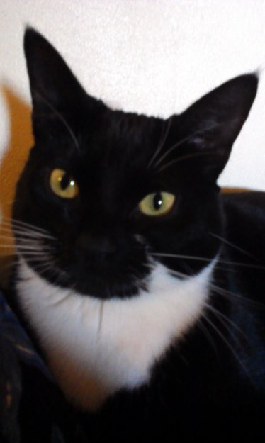 Hun er svart med hvite poter og hvit på halsen,en hvit stripe fra hals til munn på venstre side.Hun er veldig kosete,og liker mennesker.Hun er 2 år,chip/id merket og kastrert.Matmor savner deg!
