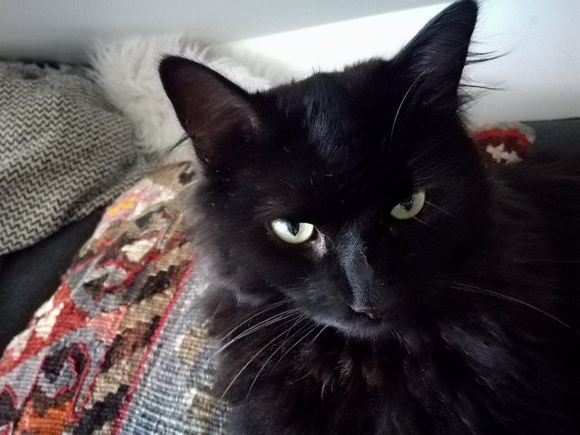 Utvokst løveklipp. Halen er fortsatt litt tynnere. Nesten helt svart, men lity grå underpels synlig på magen og baken.