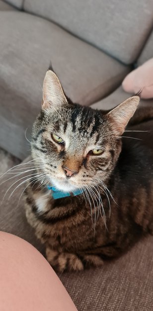Han har en hvit flekk på brystkassen, han er litt hvit på magen, han hadde ett blått sløyfe-halsbånd på seg da han forsvant, har grønne øyne, er chippet og har ID tattoovert i øret.