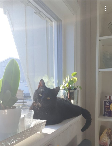 Hel svart katt, har begynt å få noen hvite hårstrå innimellom