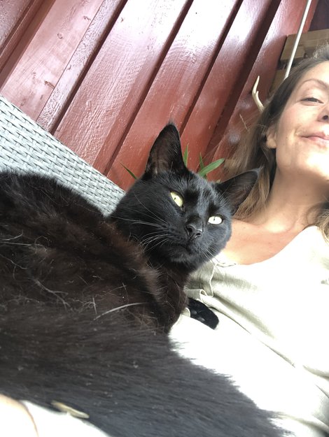 Hun er svart og slank. Rundt 7/8 år gammel. Sosial og snakkesalig pus