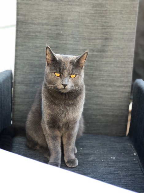 Han har kort grå pels og gule øyne.