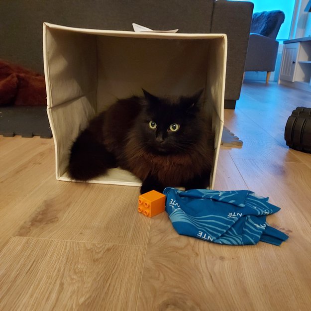 Helsvart katt, men får et brunskjær på sommer og høst.