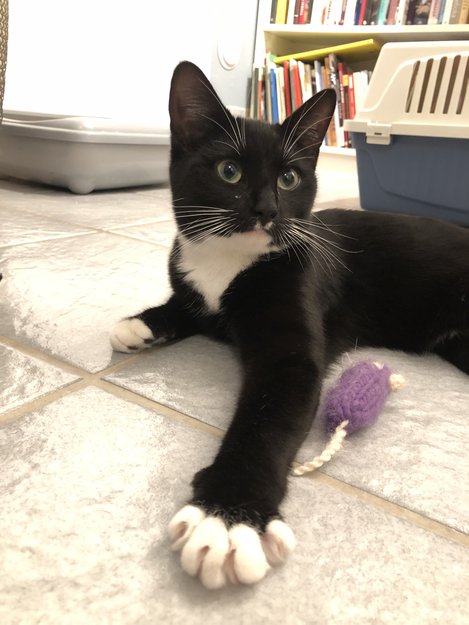 Liten, ung jentepus, dyrlege anslår at hun er mellom 6-12 mnd gammel, ikke kastrert eller id-merket/chippet. Grønne øyne, hvite tær på frempotene, hvite "sokker" på bakpotene, hvit under haken samt et par små hvite flekker rett under snuten. Sort, kort pels. Veldig tillitsfull, kosete og vant til mennesker, snill og rolig.