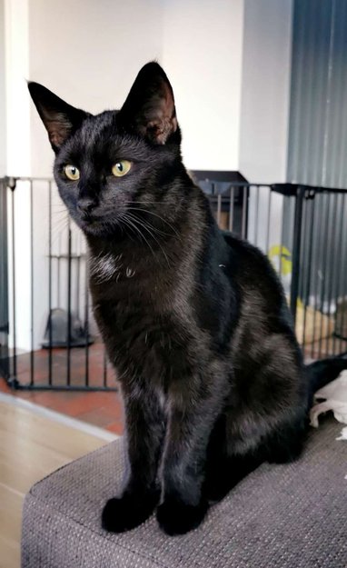 Han er helt svart med noen hvite hår på brystet og magen. Ganske stor med veldig lang hale. Han er også en veldig skravlete pus. Han er chippet. Holder til i Grindvollvegen. Vær så snill å si ifra om noen ser han