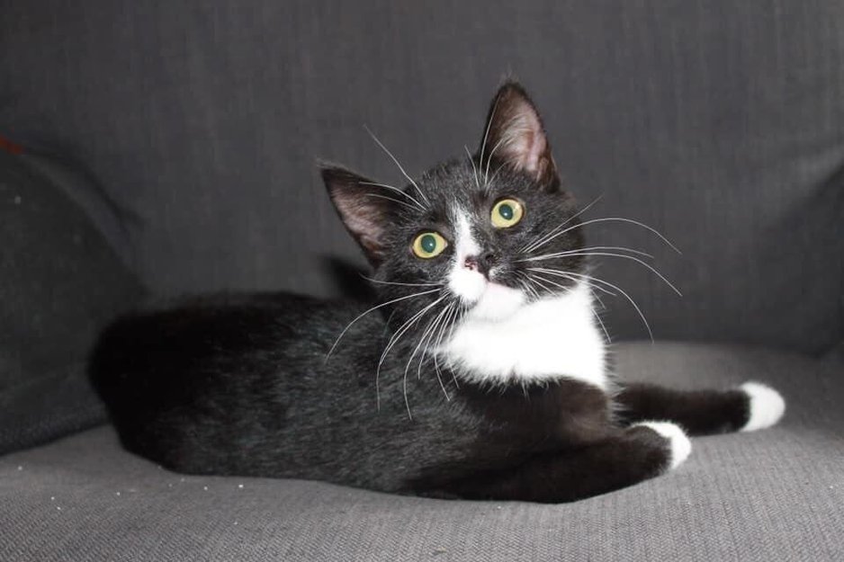 Sort korthåret katt med hvite tegninger. Hun har hvitt bliss, hvit hake, bryst og mage. Hvite værhår og hvite tær tær/poter foran, og hvite sokker bak.