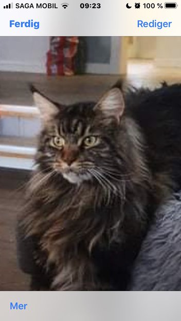 Katten er ute og innekatt. Vi har katteluke. Katten har vært borte siden 4. august og vi savner han veldig.