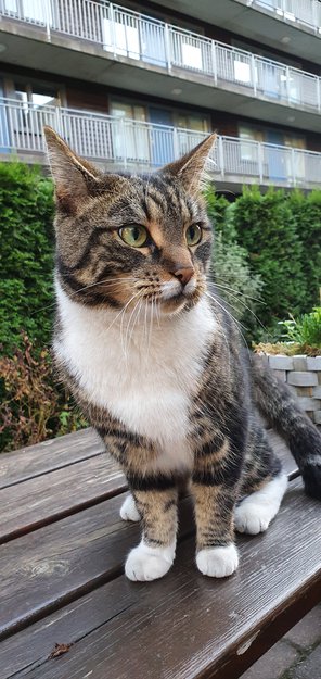Neko er spraglete og har en veldig fin hvit hals. Han veier ca 4.6 kg. Og har er veldig tillitsfull.