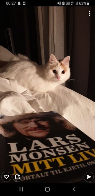 Hvit katt med oransje på halen og litt oransje på hodet. Den oransje fargen på hodet når ned til øynene men ikke under. Han er ikke veldig stor og har lite ansikt og tettsittende øyne.