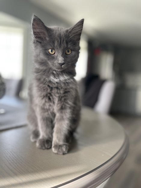 5 mnd grå langhåret kattunge, smatt ut døra og ble borte.. er veldig glad i folk og kontaktsøkende.