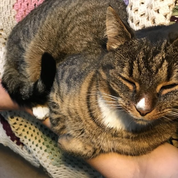 Liten hunnkatt, brun og svart tiger, hvit hals, hvite poter og hvit flekk på nesen. Tillitsfull.