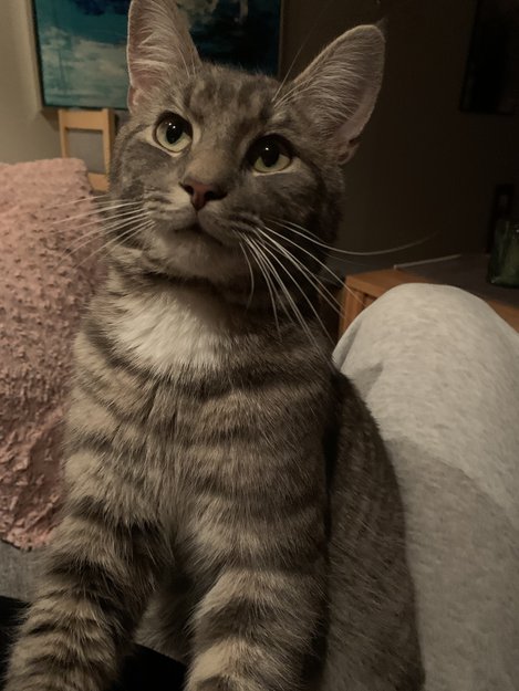 Milo er grå spraglete/stripete med hvite partier. Hvite partier under ansiktet.