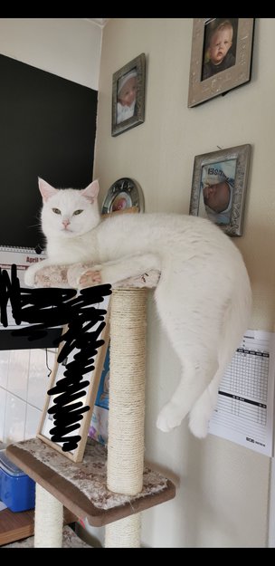 Helt hvit. Potensielt 5 sorte hår på toppen av hodet, ikke merkbare.