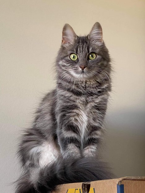 Hun har halvlang grå-brun pels med en del markeringer. Noen tydelige striper i pelsen, også litt spraglete. Hun har helt lys pels under magen. Fluffy hale.