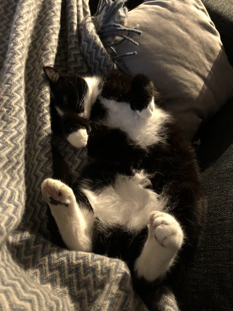 Han er hel svart over ryggen, hvitt under magen og noen av fotene hans