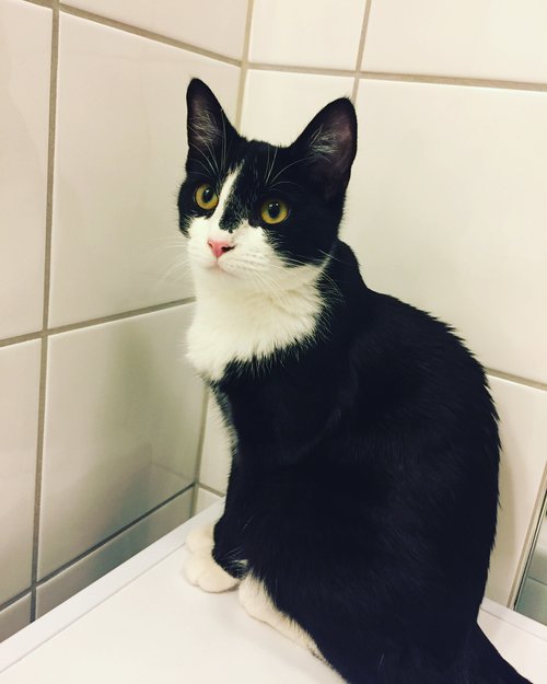 Veier litt over 3,3 kg. En svart føflekk på nesa.