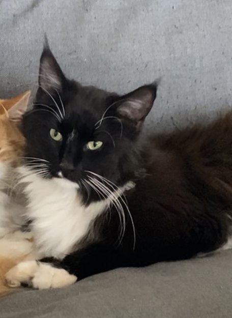 Han har lange tuster på ørene og en hvit flekk på overleppa, begynt å bli litt grå i pelsen bak ørene. Litt sky og skeptisk til fremmede. Glad i mat og godis.